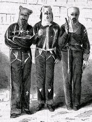 The members of KKK wear long white hooded tunics representing the ghosts of the soldiers coming back from the world of the dead to revenge on their enemies. The hoods hide the faces. Moreover the meaning of the white hooded tunics may be the "anonyminity of a well-done work", as the members assert their task has been given them by God himself, so those tunic and hood are synonym of humility. Some others say their costumes come from those of Masonry, being most of their leaders masons of Scottish rite.