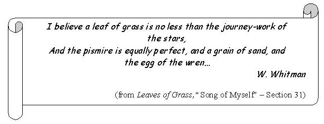 Intanto gli anni ’30 e ’40 del XIX secolo vedono la nascita del movimento Romantico Americano, detto "Trascendentalismo", la cui voce maggiore è, senza dubbio, Ralph Waldo Emerson. Nel 1854 Henry David Thoreau pubblica Walden (Life in the Woods), basato sulle proprie esperienze di vita nel Massachussets a Walden Pond. Solo un anno dopo Whitman pubblica Leaves of Grass e dedica la prima edizione, un volumetto scarno di una manciata di poesie, a colui che egli considera il suo maestro, R. W. Emerson. E’ sempre questo il periodo di altri grandi scrittori americani, come Emily Dickinson e Nathaniel Hawthorne, e il momento in cui in Inghilterra Charles Darwin sconvolge il mondo scientifico – e non solo quello – con la pubblicazione della sua Theory of Evolution insieme a Origin of Species by Means of Natural Selection. Whitman, intanto, stimolato continuamente dall’attualità politica, artistica e scientifica, espande senza sosta il suo Leaves of Grass e trasforma quel piccolo libretto in un’opera lunga tutta la sua vita.